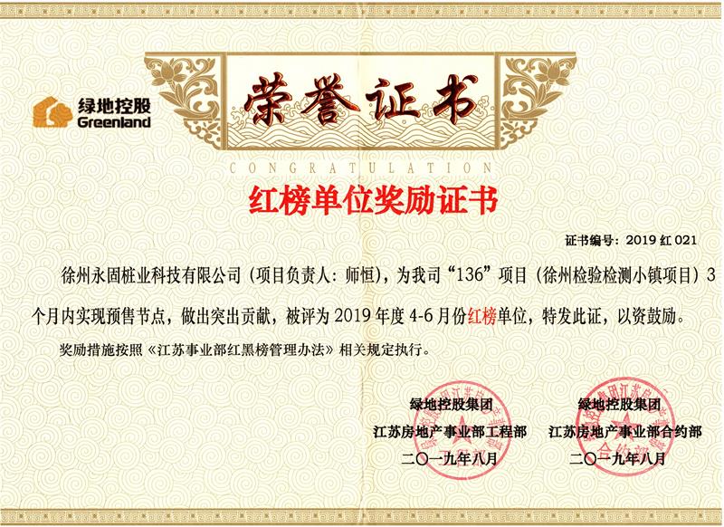綠地2019紅榜單位獎勵證...